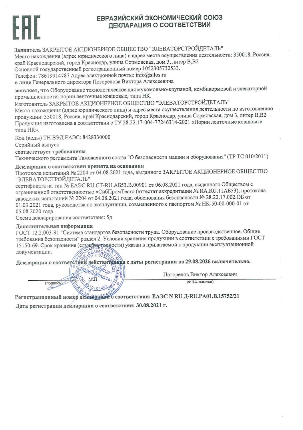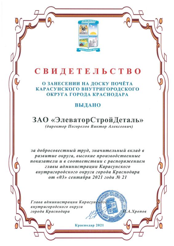 Свидетельство о занесении на доску почета Карасунского внутригородского округа города Краснодара ЗАО "Элеваторстройдеталь"